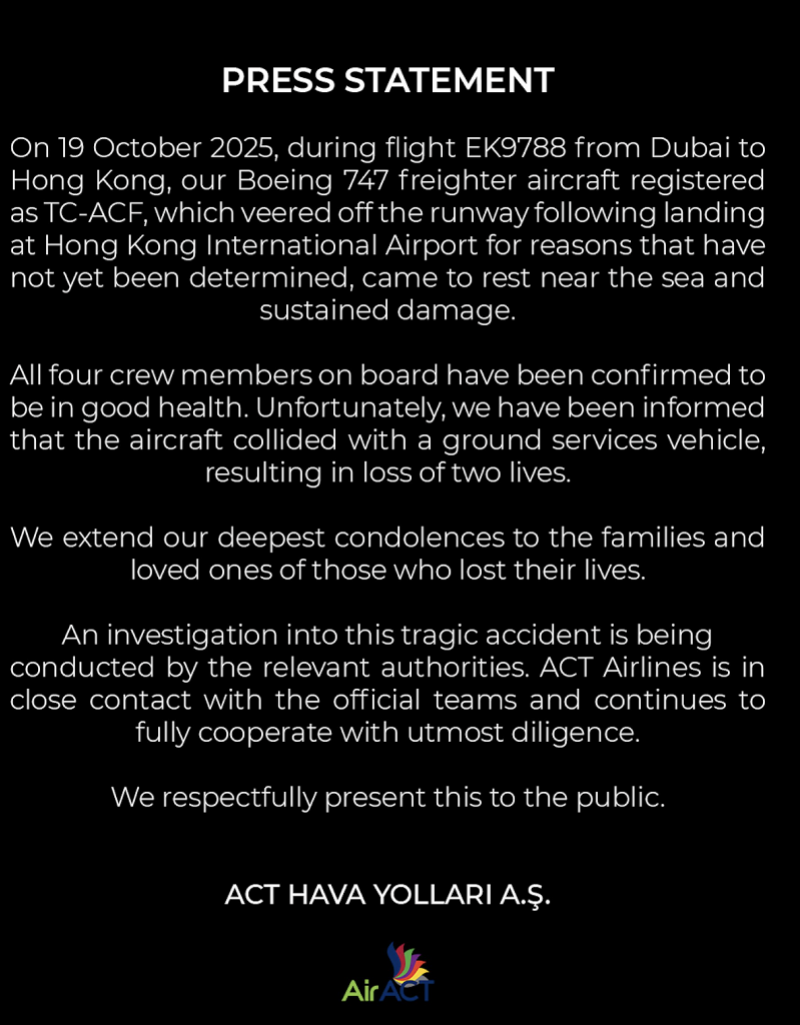南都记者注意到,涉事货机运营方为土耳其ACT Airlines,该航司发布声明称,注册编号TC-ACF的波音747货机执飞从迪拜到香港的航班时,在香港国际机场降落后偏离跑道滑入海面,原因尚不确定。机上4名机组人员均确认健康状况良好,飞机与地面一地勤车辆碰撞,导致两人死亡。